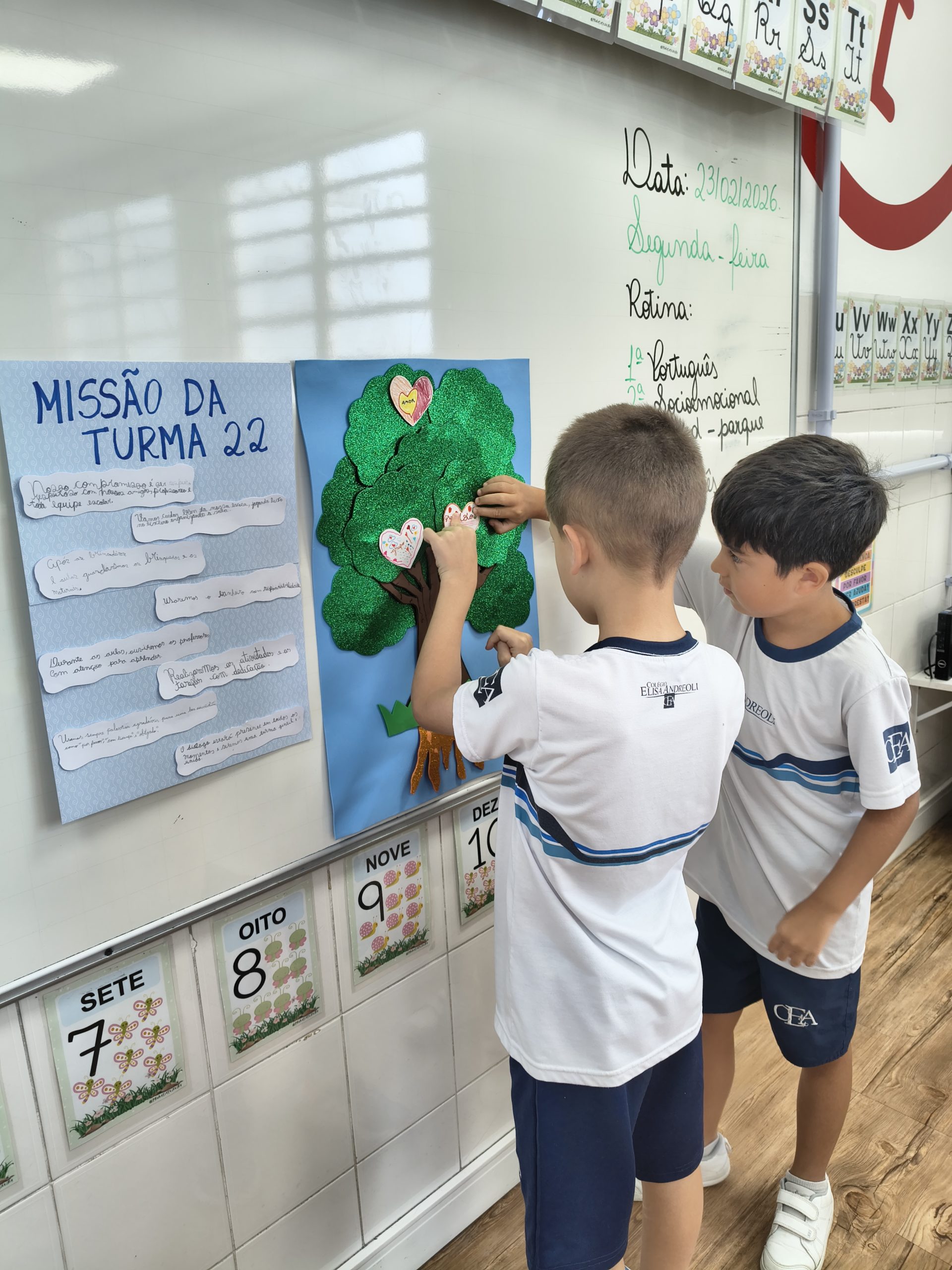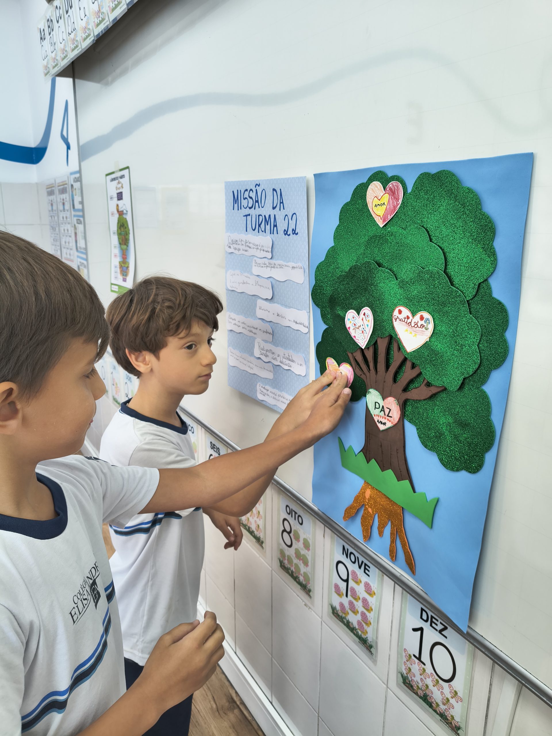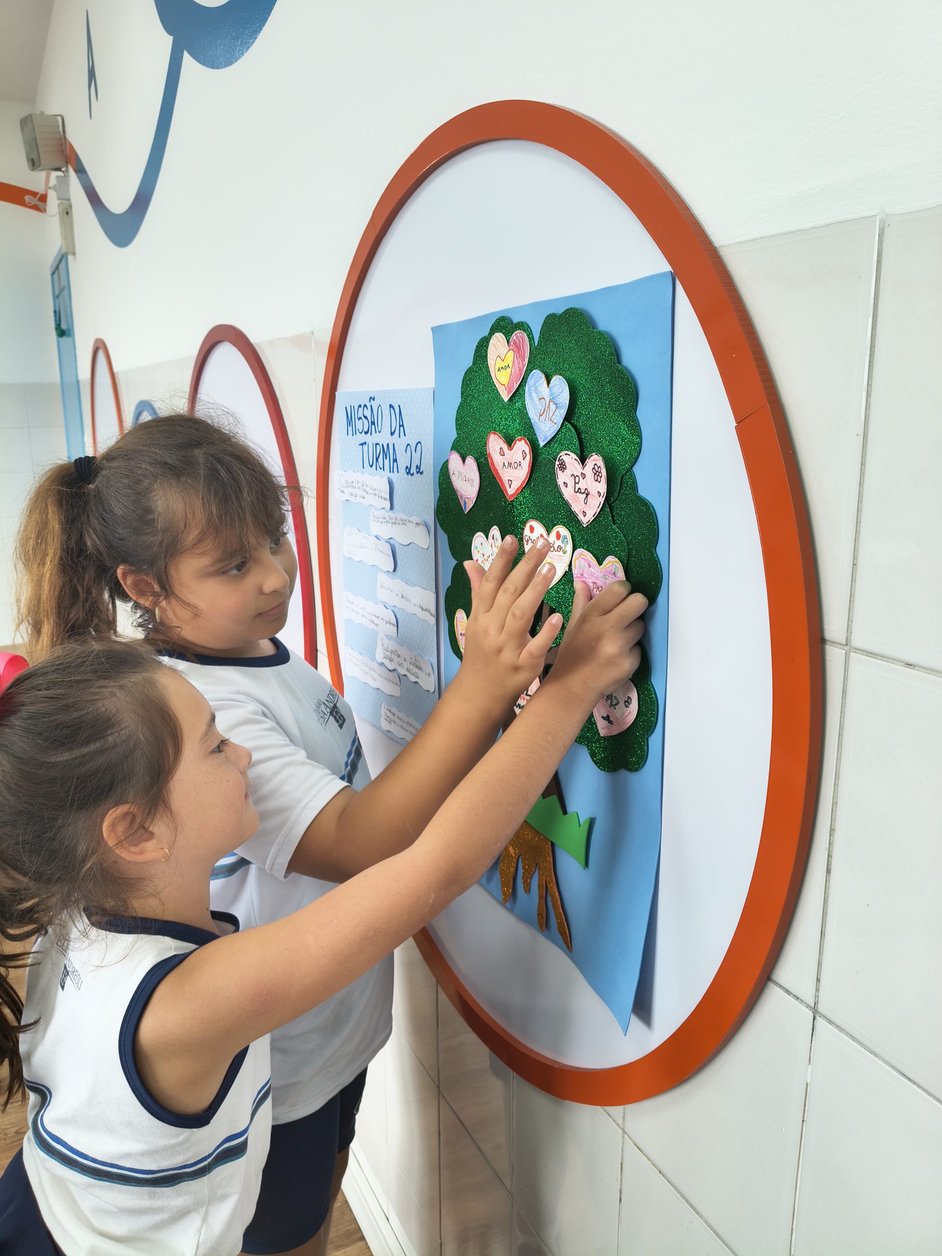 Mais do que um elemento decorativo, o mural se torna uma forma visual de reforçar valores socioemocionais que fazem parte da formação integral dos alunos. Ao passar pelo corredor e ler essas palavras, as crianças são lembradas da importância de suas escolhas, atitudes e da maneira como se relacionam com os colegas. Assim, o espaço físico da escola também contribui para fortalecer comportamentos de liderança, responsabilidade e convivência respeitosa entre todos.
