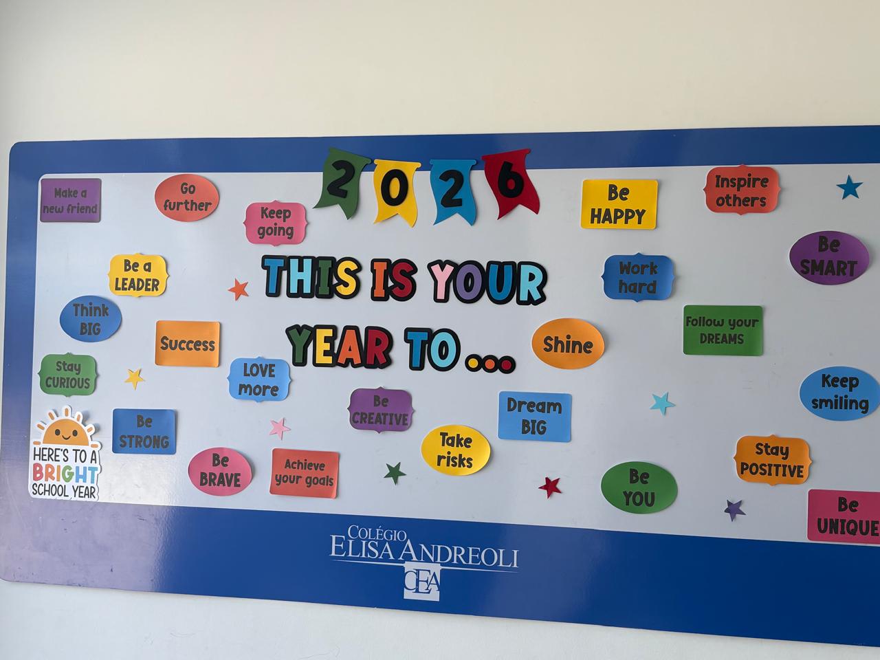 No início do ano letivo, o mural de inglês do colégio foi preparado com mensagens inspiradoras com a frase “This is your year to…” (Este é o seu ano para…), incentivando os alunos a refletirem sobre sonhos, atitudes e novos desafios para o ano que se inicia. As palavras de incentivo presentes no mural estimulam confiança, coragem, dedicação e crescimento, criando um ambiente visual que motiva os estudantes diariamente e reforça a importância de acreditar no próprio potencial.