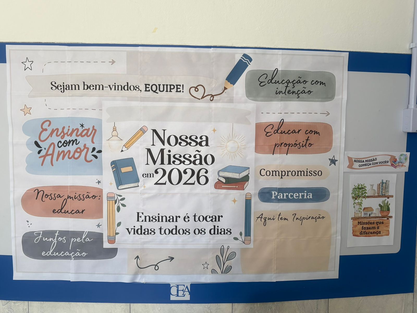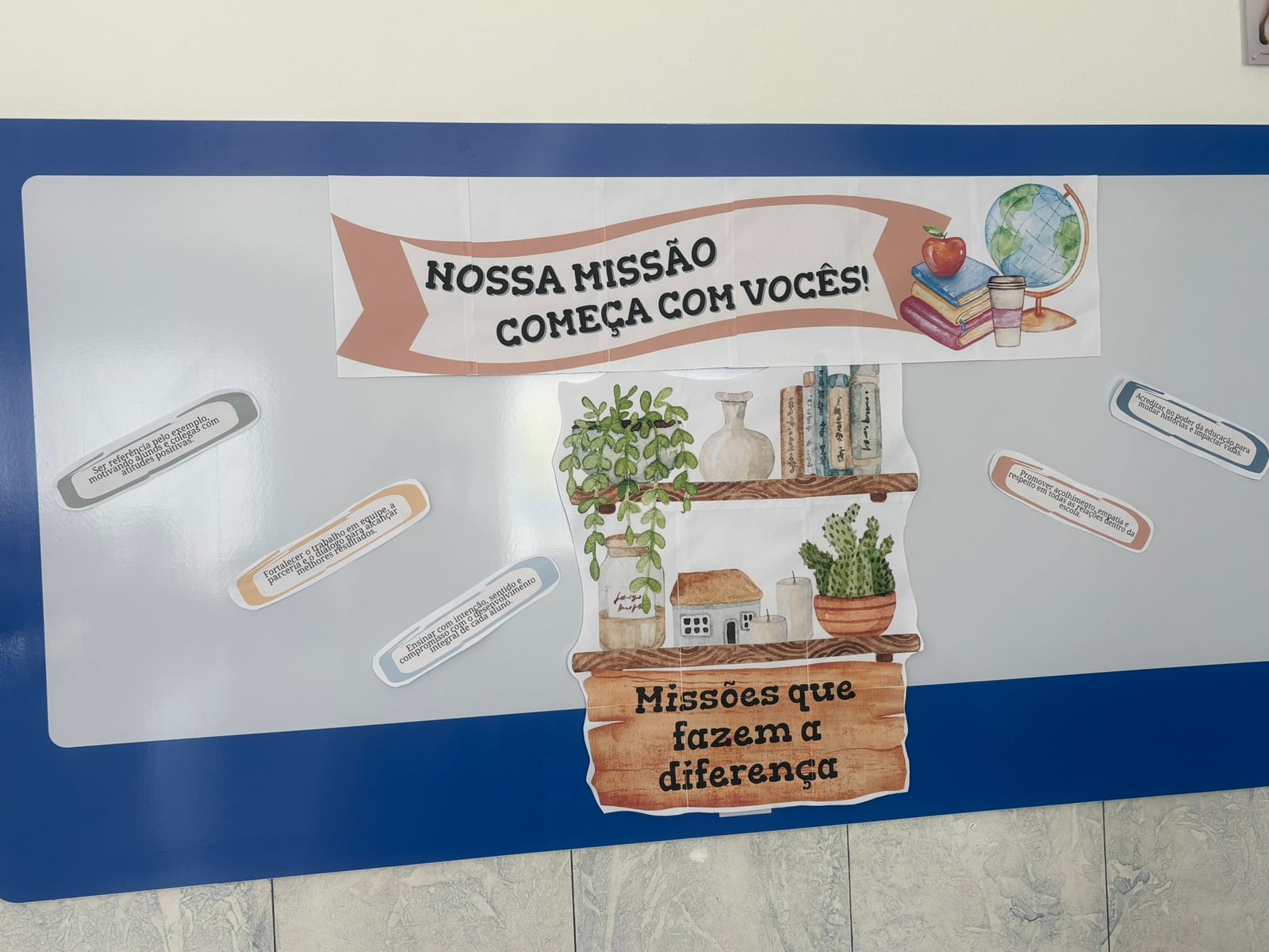 O mural da sala dos professores foi preparado com mensagens inspiradoras que representam as missões para o ano, destacando valores como ensinar com amor, educar com propósito, compromisso, parceria e dedicação. Esse espaço foi pensado para acolher e motivar diariamente a equipe pedagógica, lembrando que cada educador tem um papel essencial na formação dos alunos. Ao entrar na sala e se deparar com essas mensagens, os professores são convidados a refletir sobre o impacto positivo de seu trabalho e sobre a importância de cultivar um ambiente de aprendizagem baseado no respeito, na colaboração e no cuidado com o outro.