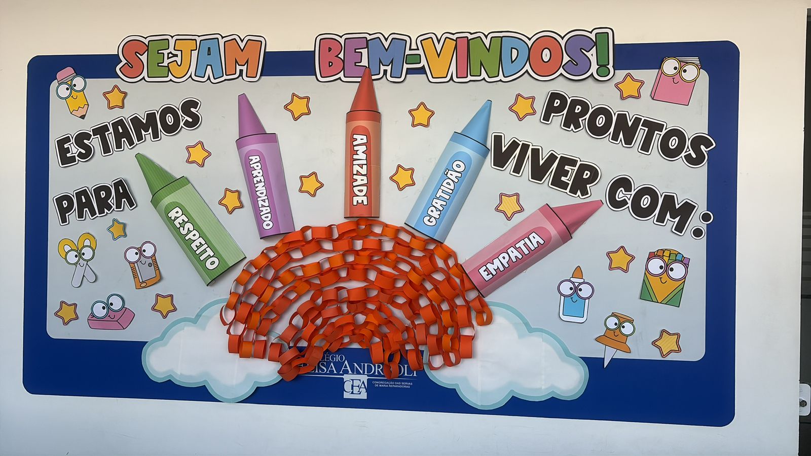 No corredor da escola, os alunos do complementar prepararam um mural especial com a frase “Estamos prontos para viver…”, acompanhado de palavras que representam valores importantes para a convivência escolar, como respeito, amizade, gratidão, empatia e colaboração. Em formato de lápis, símbolo da aprendizagem e do desenvolvimento, o mural convida toda a comunidade escolar a refletir sobre as atitudes que ajudam a construir um ambiente mais positivo e acolhedor no dia a dia.